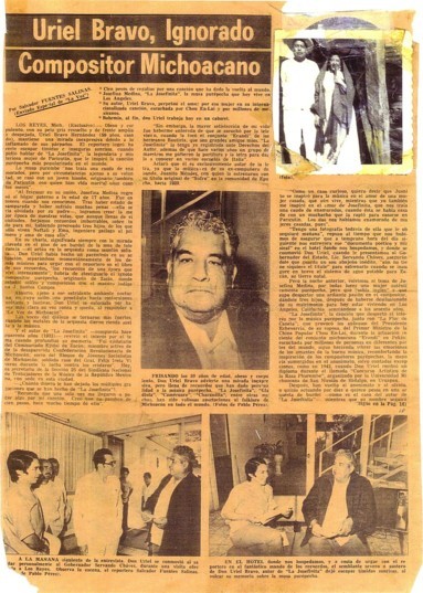LOS REYES, MICH.(Exclusivo) - obeso y corpulento, con su pelo gris revuelto y de frente amplia y despejada, Uriel Bravo Hernandez (59 años, casado), mantiene una mirada inexpresiva debido a lo inflamado de sus párpados. El reportero logró hacerle escapar tímidas e inseguras sonrisas cuando pidió hablar de "La Josefinita", la legendaria y misteriosa mujer de Paricutín, que le inspiró la canción purépecha más popularizada en el mundo. La musa purembe "nos traía una cauda de emamorados, pero por circunstancias ajenas a su loluntad, se casó con un joven bisoño, originario también de Paricutín con quien hizo vida marital unos cuantos meses. "Al fracasar en su unión, Josefina Medina regresó al hogar paterno a la edad de 17 años. Fue entoces cuando nos conocimos. Tras haber estado desamparada y haber sufrido muchas penas- ella sería olvidada por su padre-, logramos crear la mejor época de nuestras vidas, que aunque habiendo procreado tres hijos de los que sólo viven Neftalí y Emma, ingeniero geólogo el primero y ama de casa ella". En su charla, significada siempre con la mirada clavada en el piso...........
